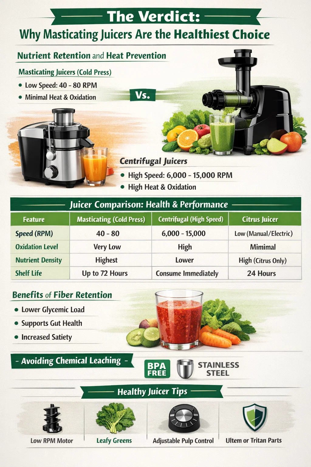 När man prioriterar hälsa och näringstäthet masticating juicer (även känd som en kallpress juicer) är den hälsosammaste typen av juicer tillgängliga. Till skillnad från höghastighetsmodeller använder juicepressare en långsamt vridande skruv eller skruv för att krossa frukt och grönsaker, vilket minimerar värmefriktion och oxidation . Denna skonsamma process säkerställer att känsliga vitaminer, mineraler och levande enzymer förblir intakta, vilket ger en mer näringsmässigt potent dryck som kan hålla sig fräsch i upp till 72 timmar.